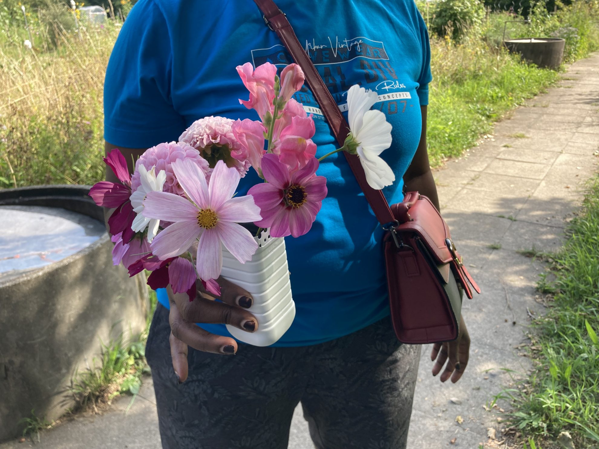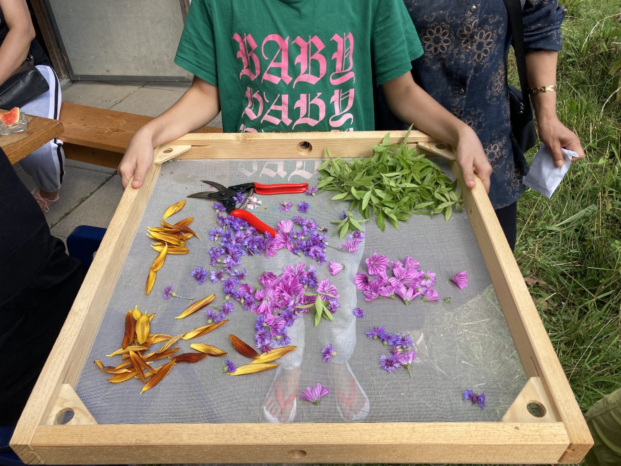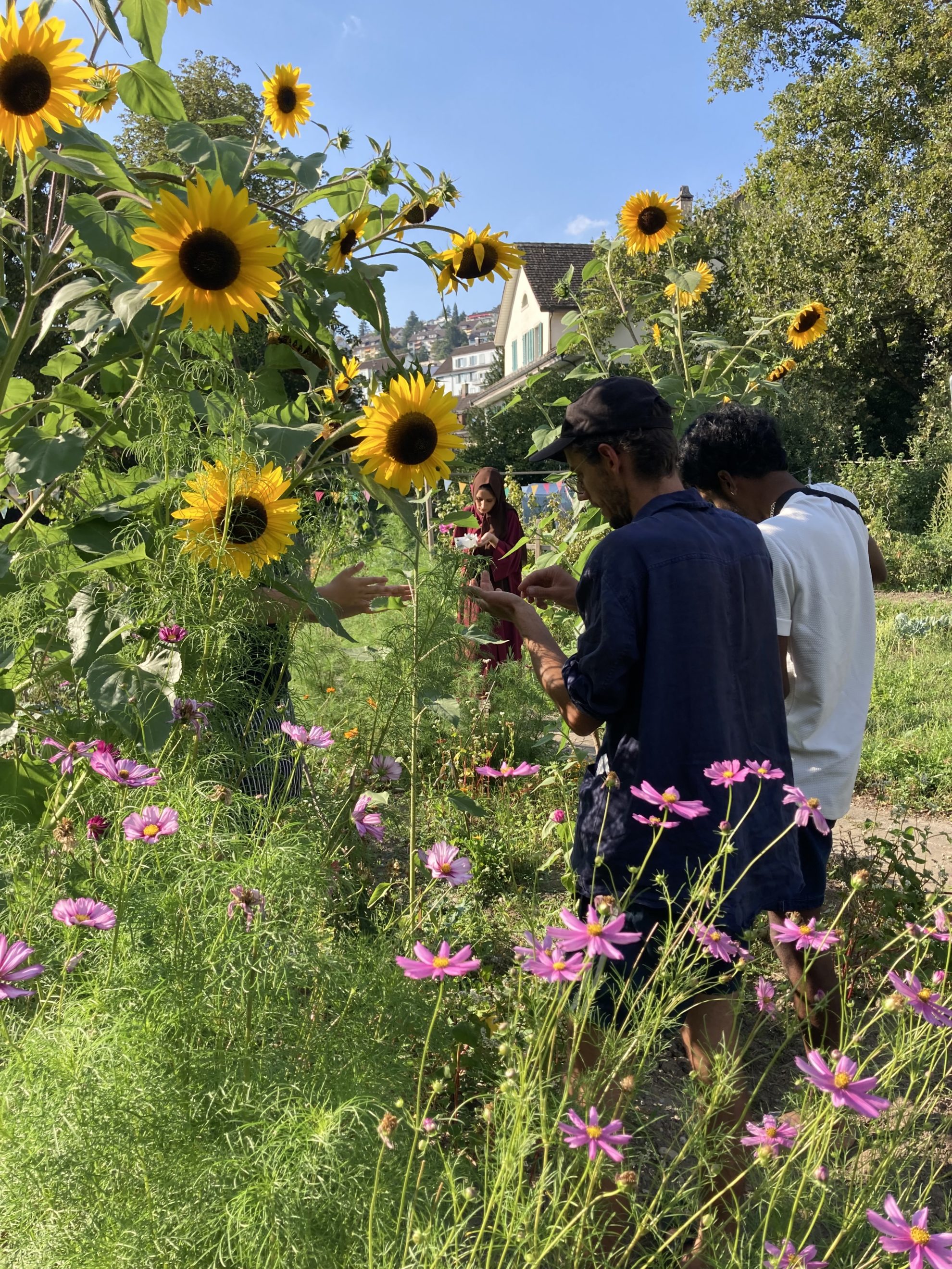 Die Blumen sind die Protagonistinnen der Beete. Ebenfalls wachsen Kräuter und Beeren. Auch Saatgut von Blumen wurde geerntet. Für viele Menschen im BAZ und andere Geflüchtete ist das Blumenfeld am Fluss Ausflugsziel für botanisch/kulinarische und zeichnerisch/malerische Workshops und dient als Erholungs-Ort.